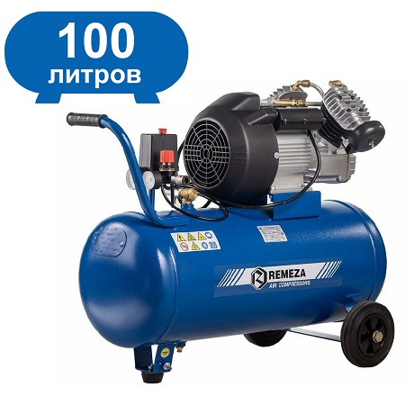 Воздушный поршневой компрессор REMEZA с ресивером 100 л, масляный, двухцилиндровый, мощностью 2,2кВт, Напряжение 220В. Производительностью 400 л/мин с коаксиальным приводом применяется в строительных, автосервисных и медицинских работах.