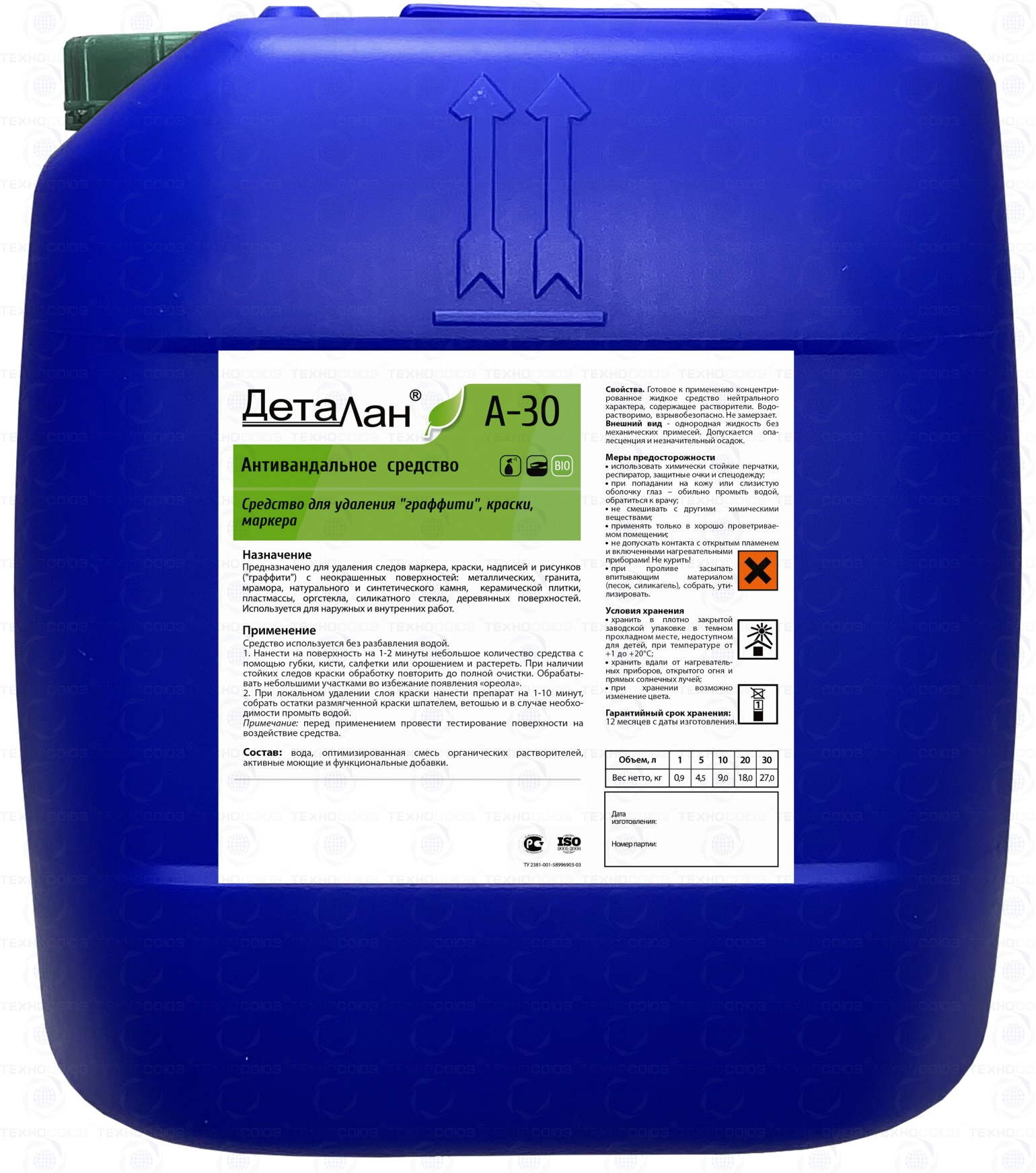 Деталан А-30 - это средство предназначено для удаления следов маркера, краски, надписей и рисунков ("граффити") с неокрашенных поверхностей - металла, гранита, мрамора, натурального и синтетического камня, керамической плитки, пластмассы, оргстекла, силикатного стекла, деревянных поверхностей. Используется для наружных и внутренних работ.