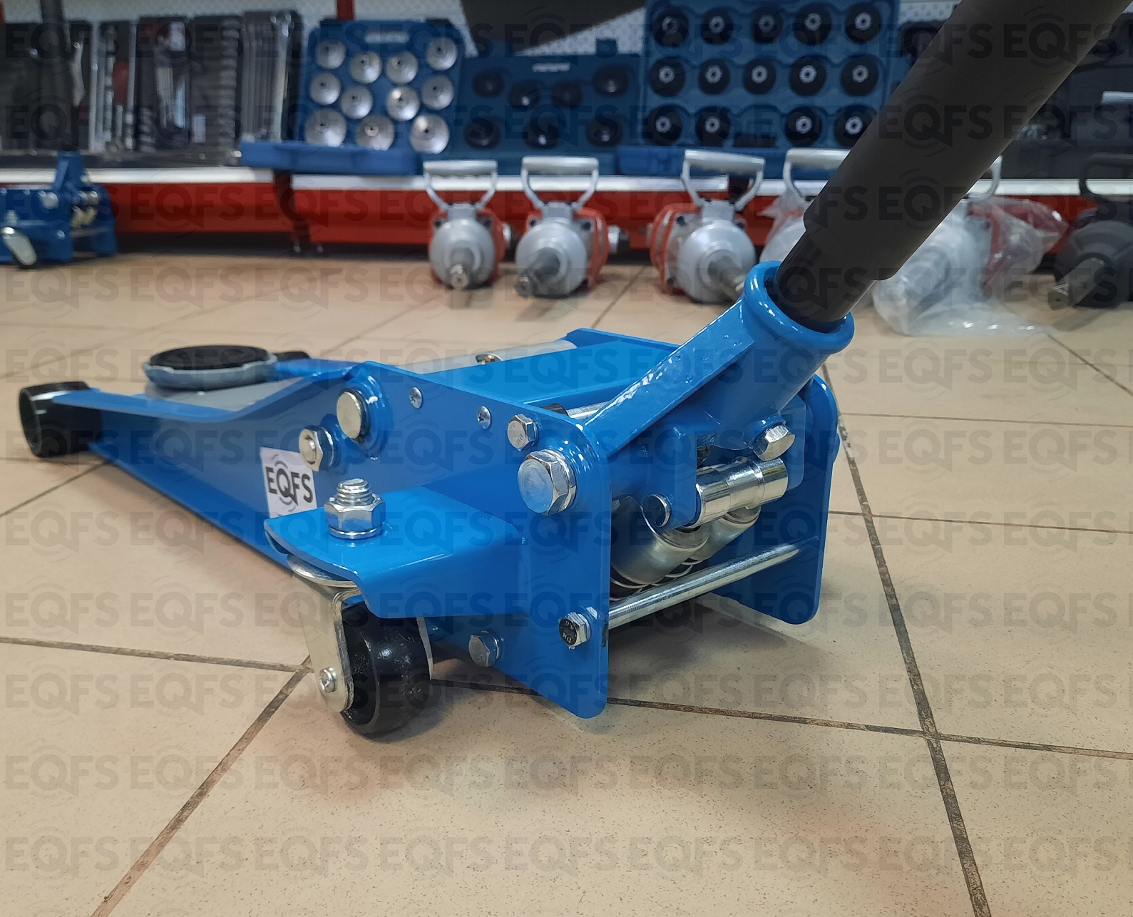 Домкрат подкатной low profile рекомендуется к применению в шиномонтажных мастерских и автосервисах для поднятия автомобилей с низким клиренсом. Цвет темно-синий.