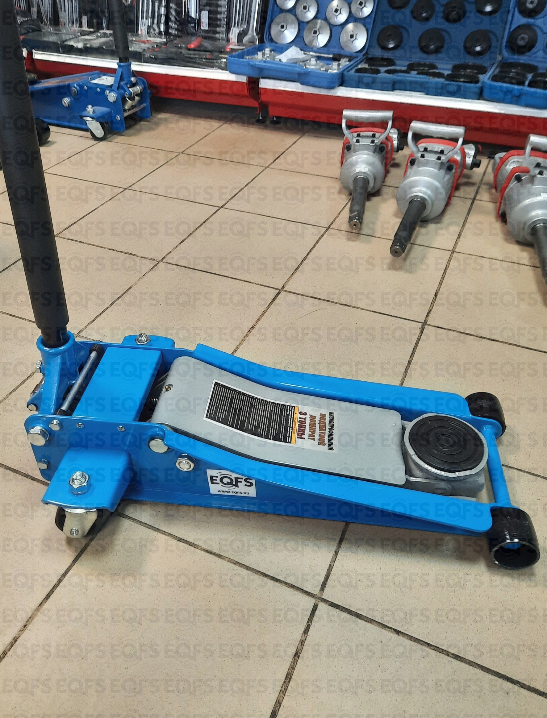 Для профессионалов. Низкопрофильный. Подкатной. Двухштоковый механизм с усиленной конструкцией. Быстрый подъем. С тавотницей. Для применения в шиномонтажных мастерских и автосервисах для поднятия автомобилей с низким клиренсом.  г/п 3 тонны. Высота подъема мин / макс - 75-505 мм. Масса 34 кг.
