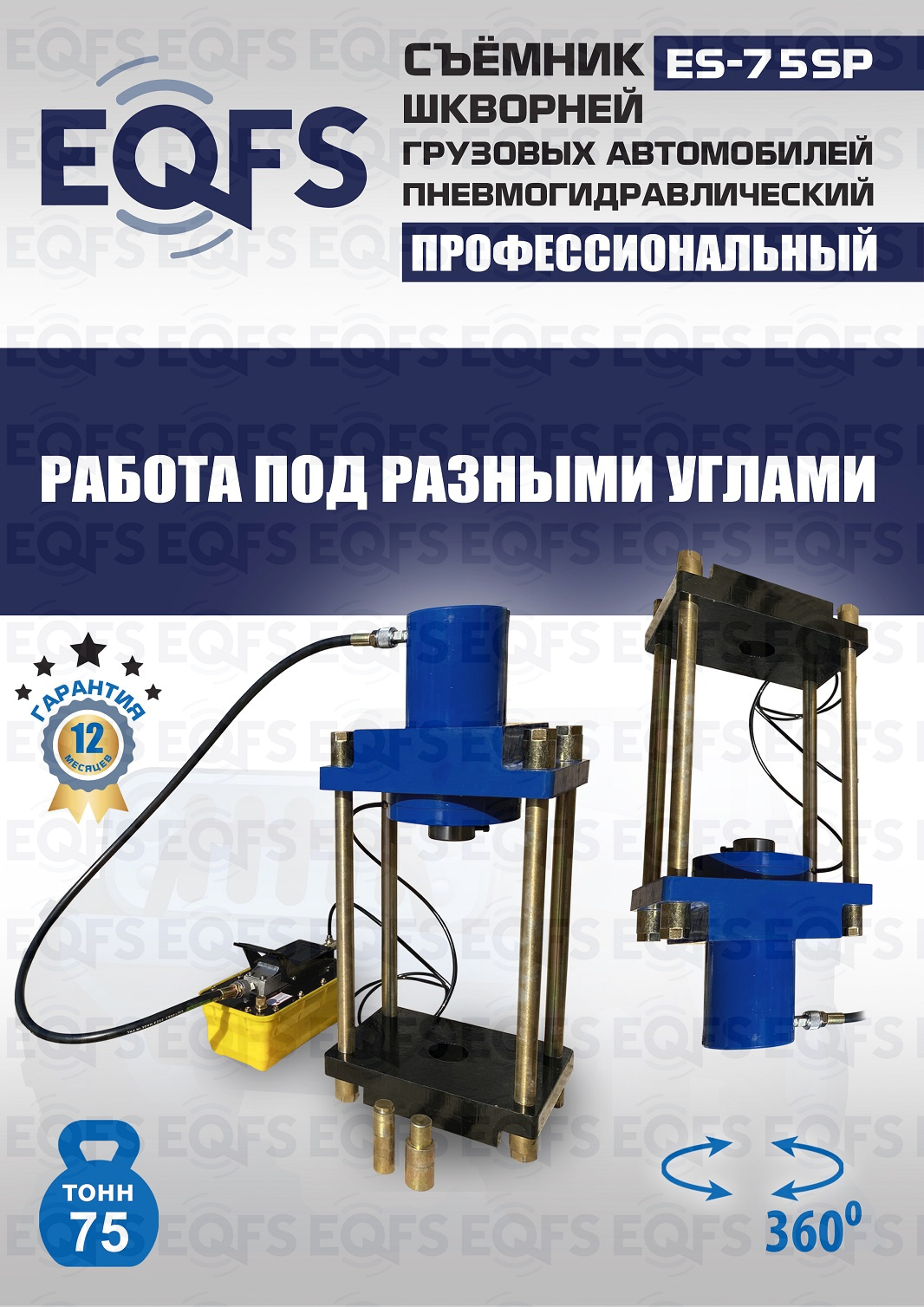 Позволяет работать под разными углами. Сокращает время ремонта. Для выпрессовки шкворней из поворотной цапфы погрузчиков, тракторов, строительной техники, коммерческих и грузовых авто отечественного и импортного производства: MAN, MERCEDES, SCANIA, VOLVO, Корейские и Китайские авто. Пневмогидравлический привод. Рабочее окно 400x320 мм. Усилие 75 тонн.
