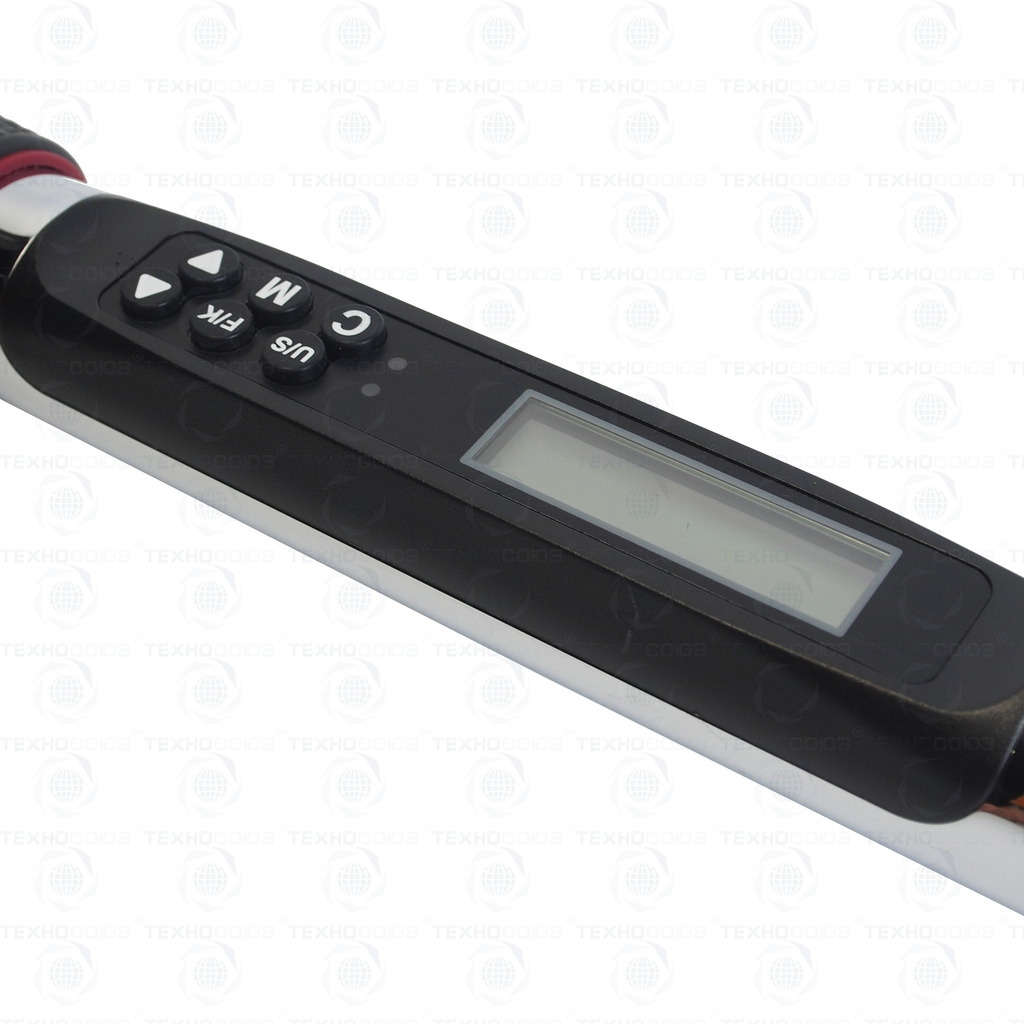 Ключ динамометрический с цифровой индикацией. Храповый механизм на 72 зуба, угол поворота 5'. Посадочный квадрат: 1/2". Диапазон усилий затяжки: 17-340 Н·м. Длина 666 мм. Цифровое считывание значения крутящего момента с функцией запоминания на 30 ячеек памяти. Жидкокристаллический экран с подсветкой. Мигание светодиода и звуковой сигнал. Если крутящий момент достигает 90% от предустановленного значения включается вибрационный сигнал.