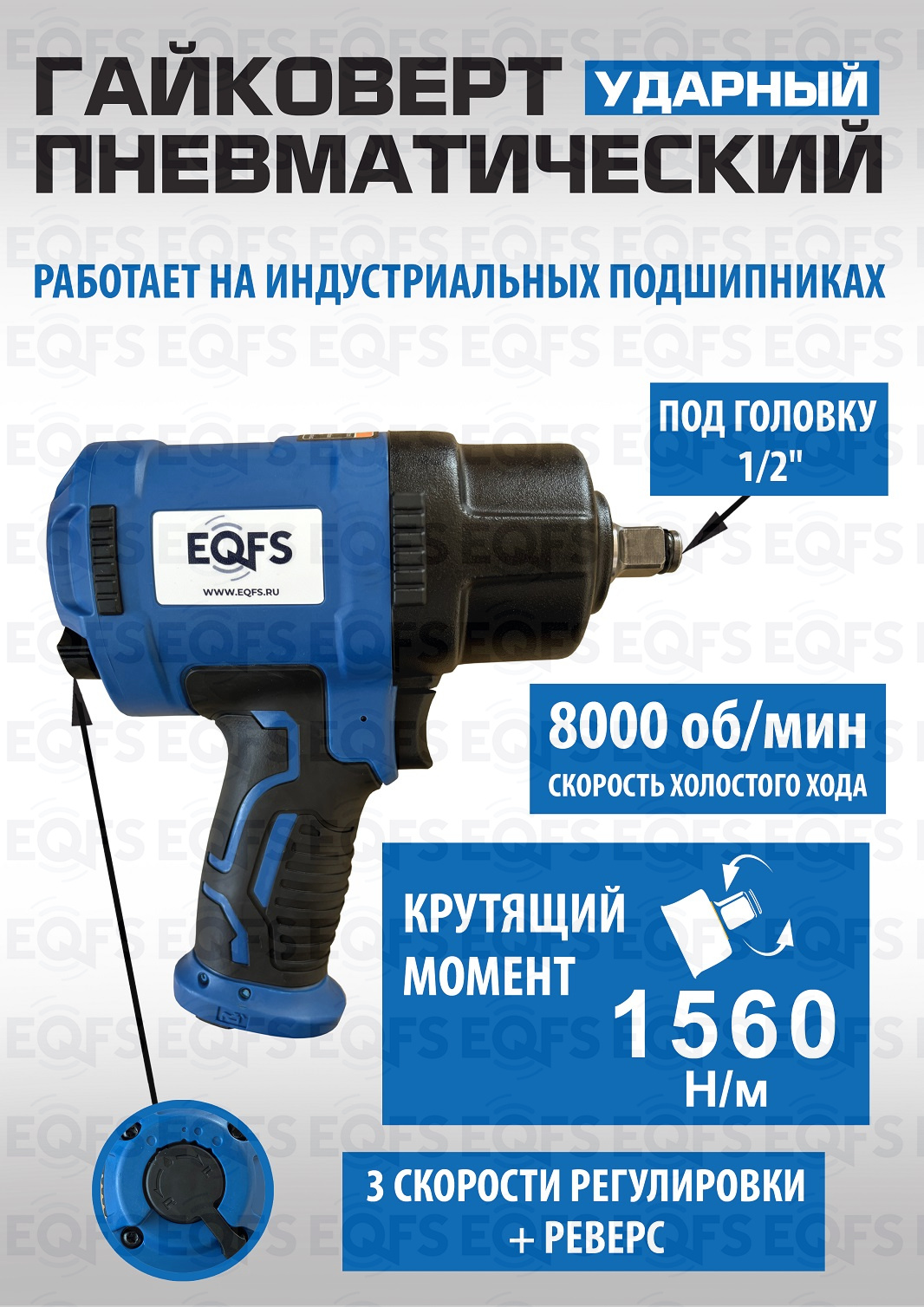 ES-7125 Пневмогайковерт 1/2". ПРОФЕССИОНАЛЬНЫЙ. Позволяет открутить сильно прикипевшую гайку или болт. Устойчив к перегрузкам - работает на индустриальных подшипниках. Ударопрочный - изготовлен из морозо/ударо- устойчивого пластика (облегченный композитный корпус). Обрезиненная рукоятка. Реверс, регулировка крутящего момента – 3 режима. Под головку 1/2”. Крутящий момент 1560 Нм. ВЕС-2,0 кг.