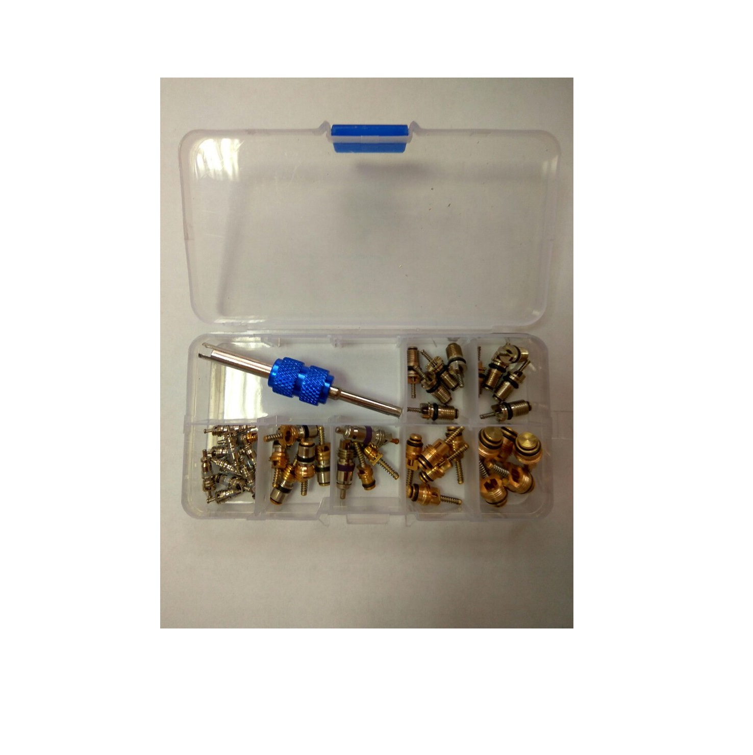 Комплект для заправки автомобильных кондиционеров состоит: автоматическая установка для заправки кондиционера, фреон, масло, течеискатель хладагента, набор золотников, ультрафиолетовая добавка, набор резиновых колец, набор колпачков и цифровой термометр
