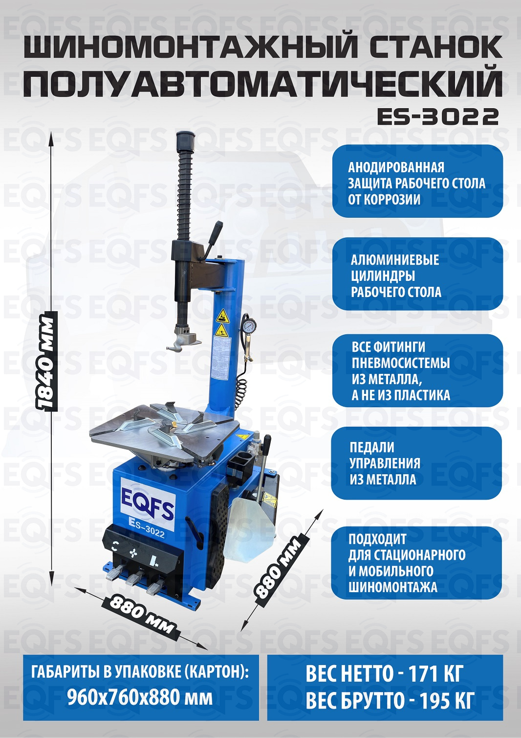 ES-3022 станок шиномонтажный полуавтомат. Внешний зажим 11-21”. Внутренний зажим 12-24”. Поставляем на 220В и 380В. В комплекте: пистолет для подкачки шин + монтажка + регулятор давления с влагоотделителем и манометром. Рекомендуется для постов со средней и высокой проходимостью