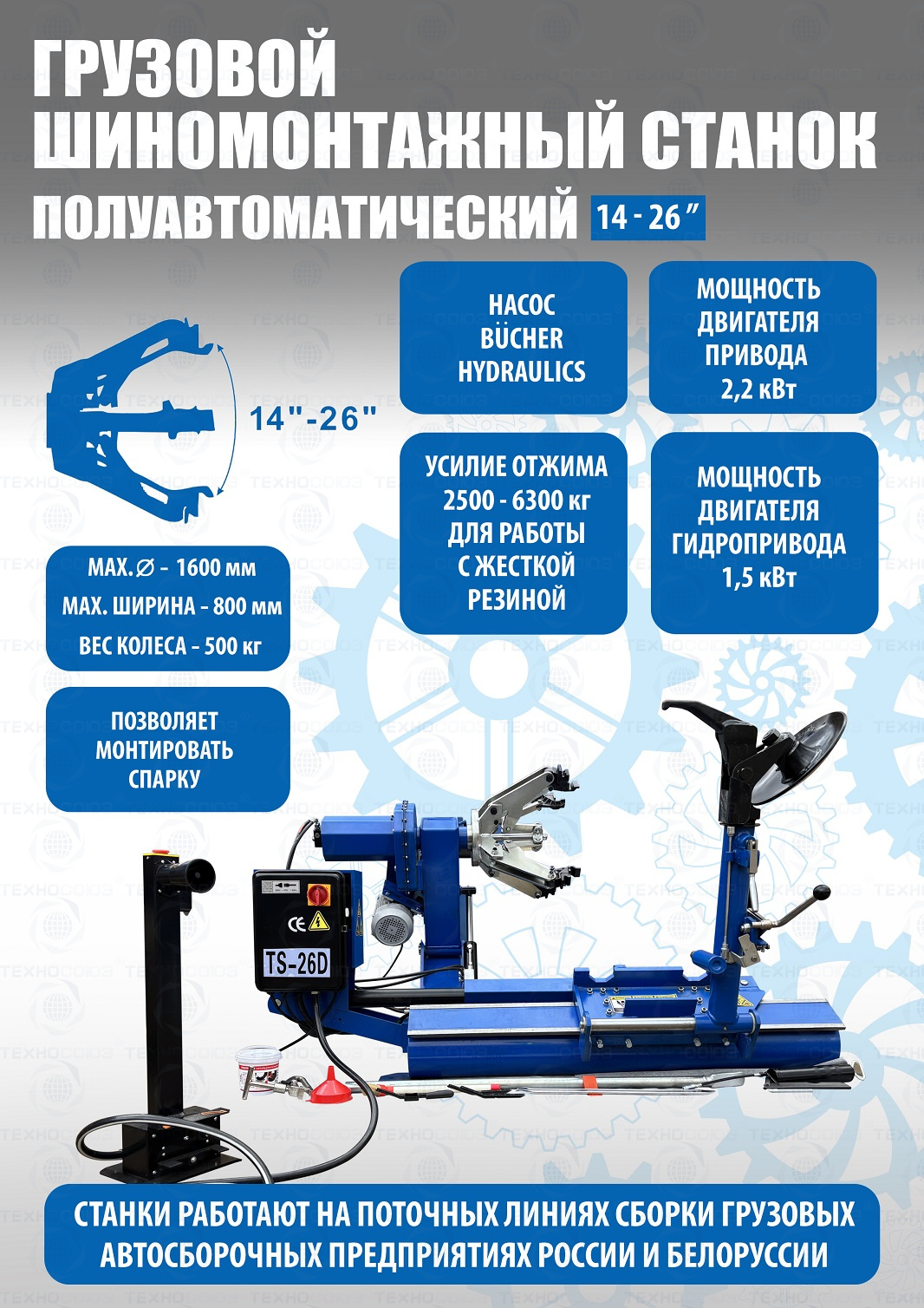 Комплект из полуавтоматического грузового шиномонтажного станка TS-26D. Отказов и рекламаций нет!!!  Диски сталь, AL, с кольцами и без, 14÷26” с адаптерами 14÷42”(опция), Колесо макс. Ø1600 ширина 780мм, до 500кг. Моторы 1,5 + 2,2кВт. Гидравлика – немецкая «BUCHER HIDRAULICS». Гарантия до 18мес. + Грузовой балансировочный станок Smart Trucker подходит для балансировки колес грузовых и легковых автомобилей с диаметром диска от 9 до 28 дюймов (при ручном вводе до 30 дюймов) и шириной от 3 до 20 дюймов. Два режима работы. Настройка «нуля». Программа автоматической калибровки. Программа самодиагностики (режим ТЕСТ). В стандартную комплектацию входит подкатная тележка с ручным подъемником.