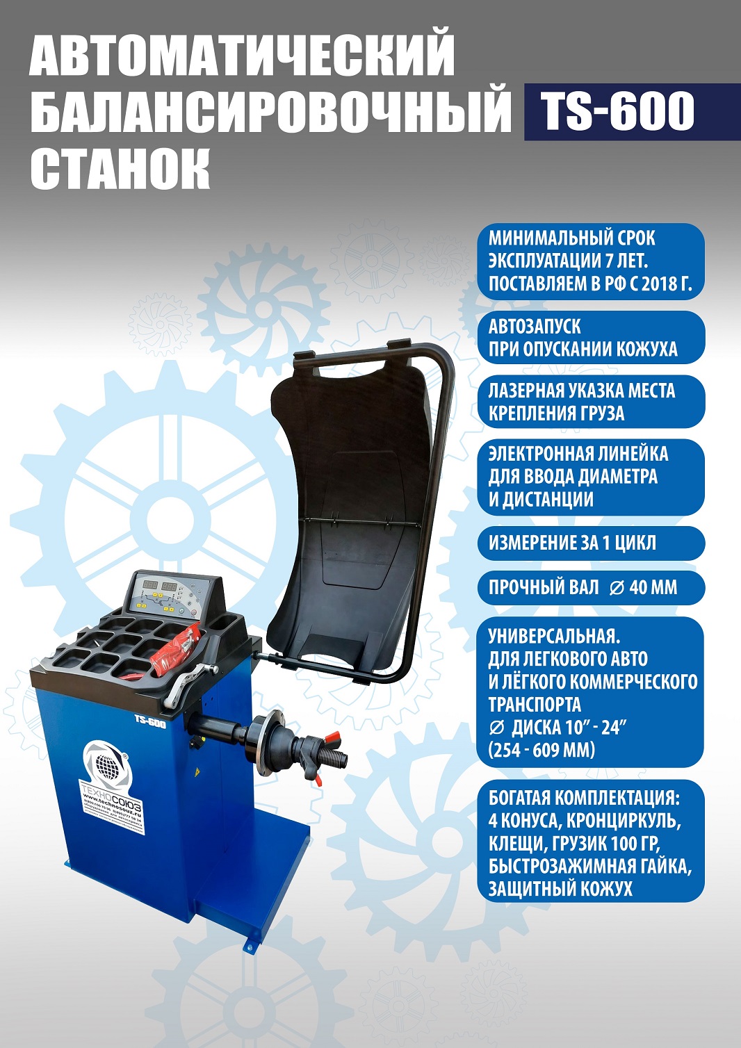 TS-600 Автоматический балансировочный станок. Автоматический ввод двух параметров, доворот и фиксация колеса в месте установки грузиков, лазерная указка места установки. Балансировка 8 сек. В комплекте: кожух с автозапуском + клещи + кронциркуль + быстрозажимная гайка + набор конусов. Для колес с диаметром диска с резиной до 800 мм. Размеры диска: ширина 3–10” (76-254 мм), диаметр диска 10–24” (254÷609 мм).