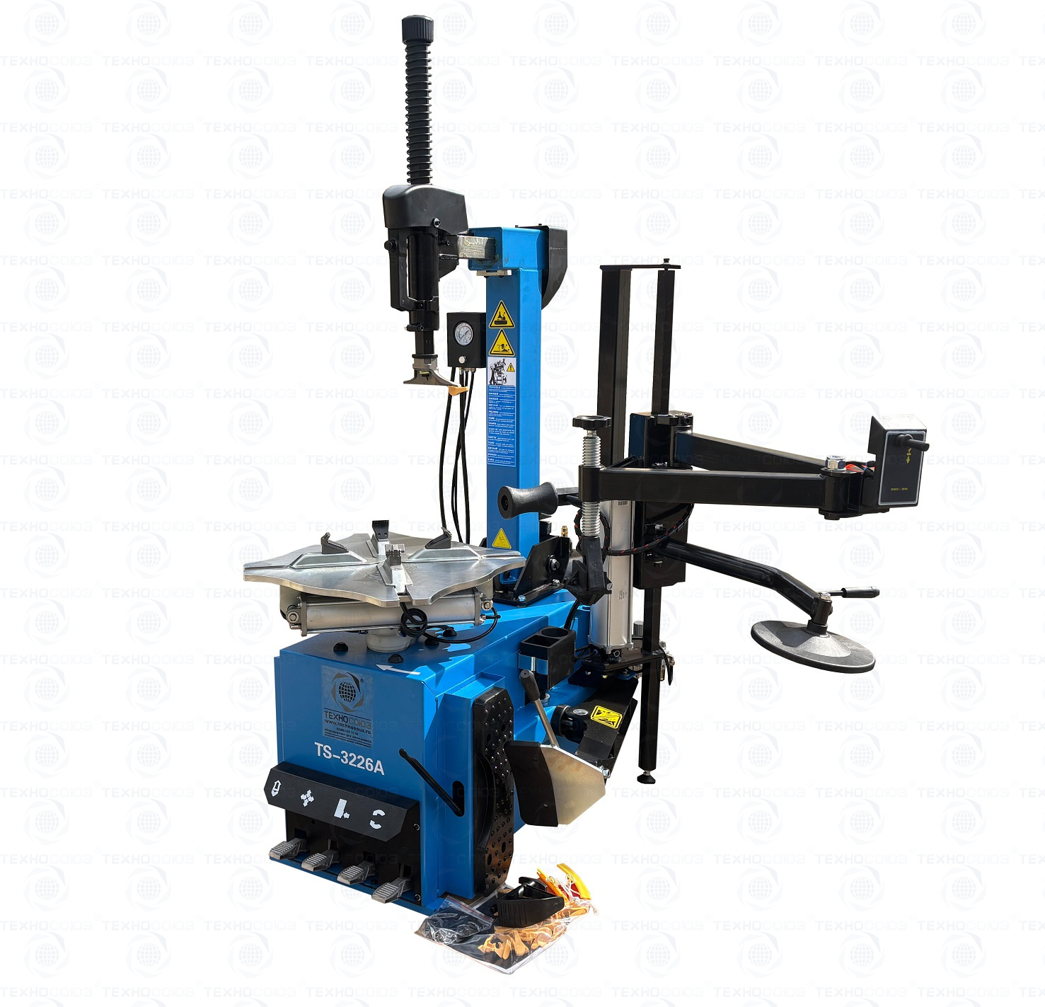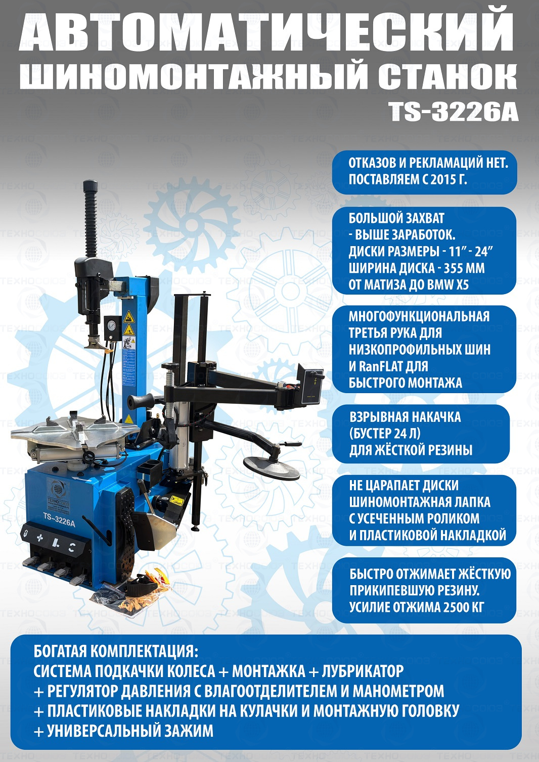 Автоматического шиномонтажного станка TS-3226А для колес легковых автомобилей, легких грузовиков, не больших автобусов и коммерческой техники. Для дисков: 11÷24”. В комплекте: полноценная 3-я рука для работы с жесткой и низкопрофильной резиной RUNFLAT. + встроенный бустер 24 литра (взрывная подкачка) + пистолет для подкачки шин + монтажка + регулятор давления с влагоотделителем и манометром.