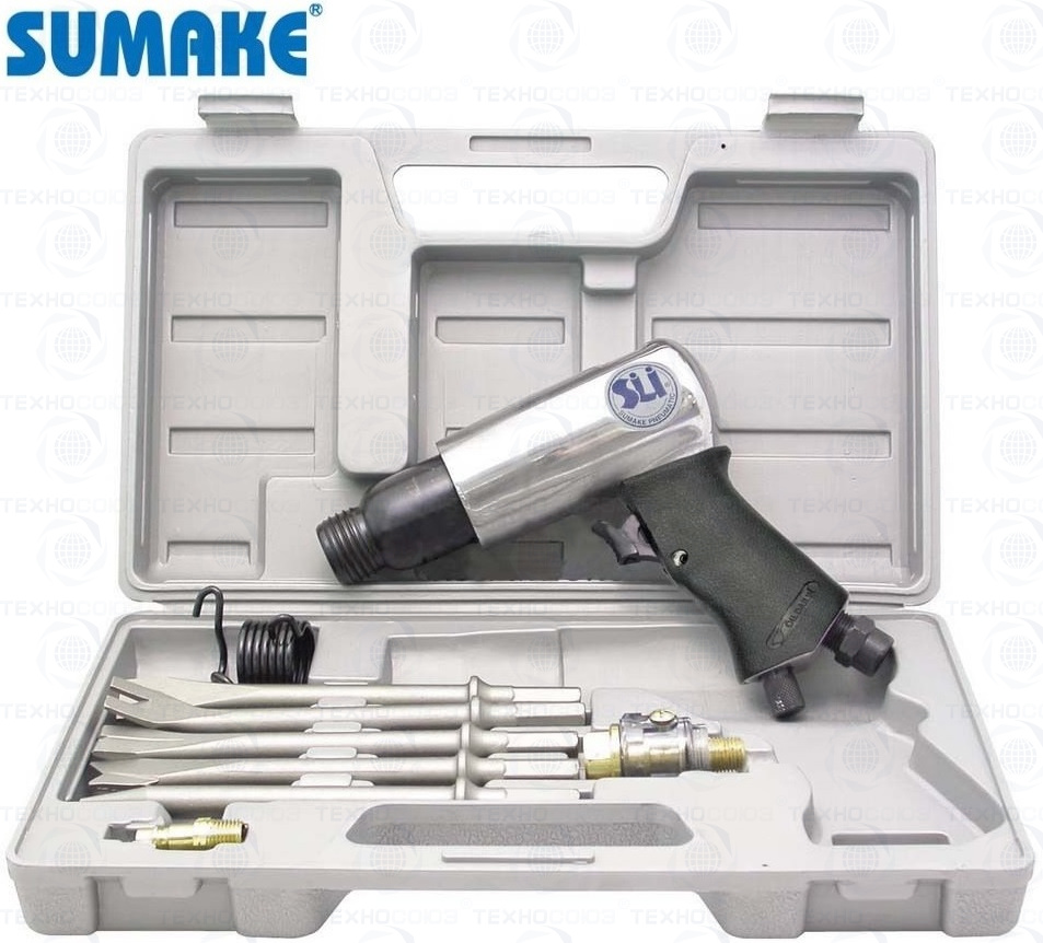 Пневмомолоток + 4 зубила предназначены для проведения как отбойных, так и зачистных работ. Частота ударов 3000/мин. Длина хода поршня 66 мм. Хвостовик зубила (шестигранник) 10,1 мм.