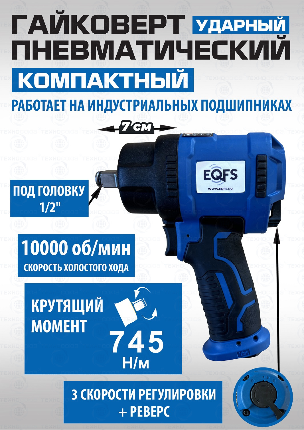 + Пневмогайковерт работает на индустриальных подшипниках. Ударопрочный. Обрезиненная рукоятка. Реверс, регулировка крутящего момента – 3 режима. Под головку 1/2”. Крутящий момент 1560 Нм.