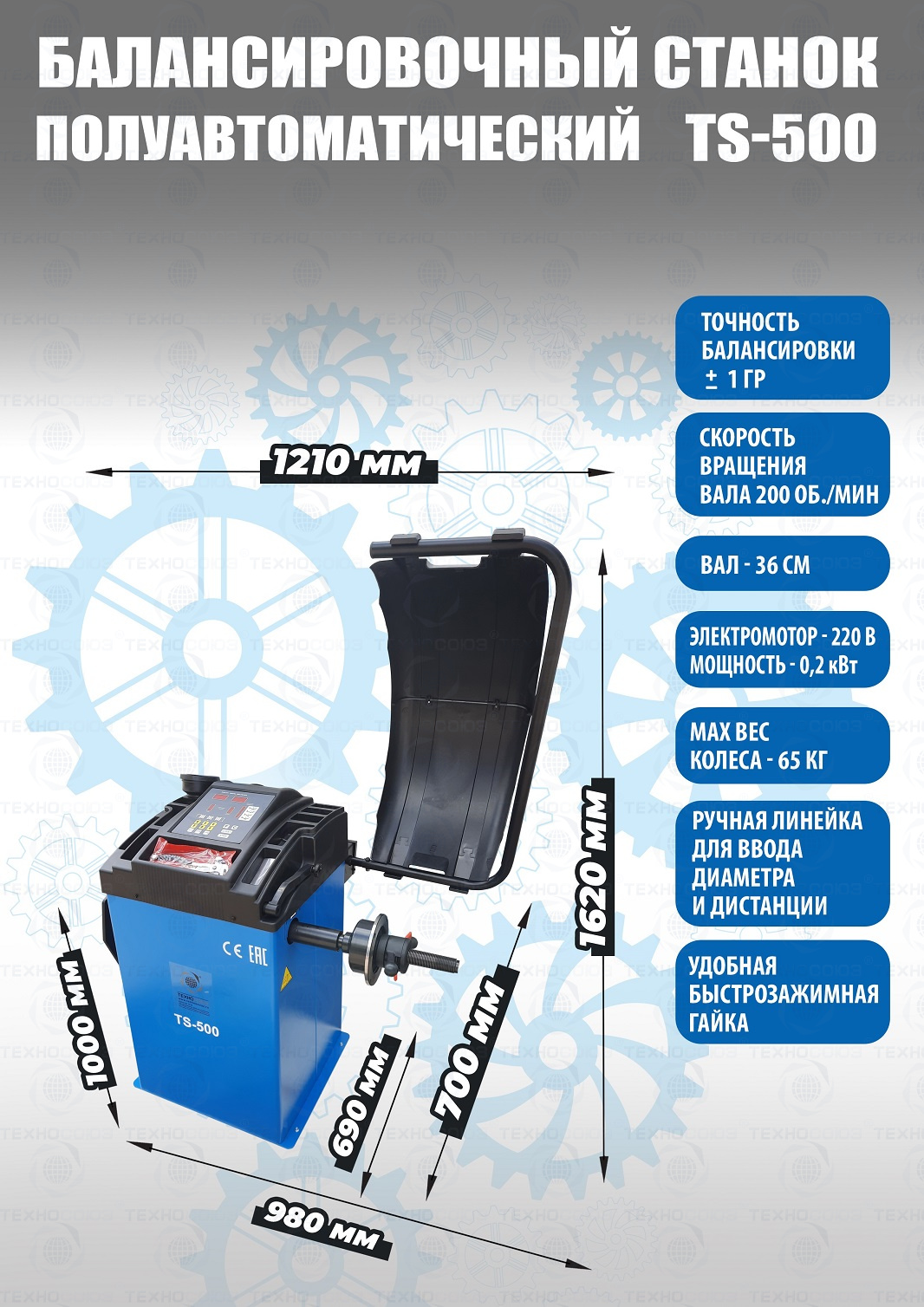 + TS-500 Балансировочный станок для колес легковых автомобилей, мотоциклов и легких грузовиков. В комплекте: кожух с автозапуском + клещи + кронциркуль + быстрозажимная гайка + набор конусов. Диаметр диска с резиной до 760 мм. Размеры диска: ширина 3–9” (76-228 мм) , диаметр диска" - 10–21” (254-533 мм). Вал-36 мм. Максимальный вес колеса с диском – 65 кг. Точность ±1гр. Напряжение 220В. Данные станки возим более 10 лет. Надежные - не подведут в сезон!!! .