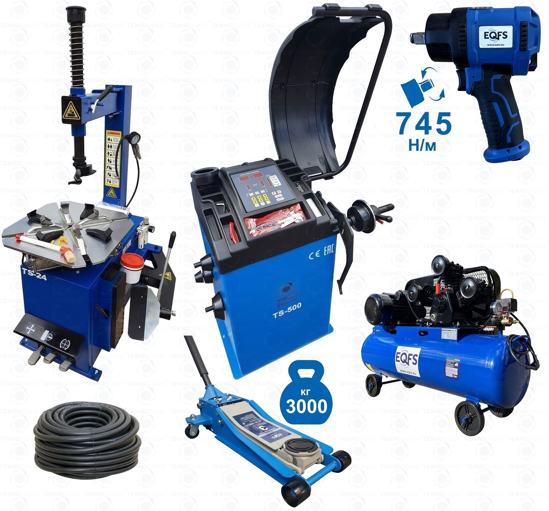 шиномонтажного станка TS-24. Полуавтоматический. Квадратный стол. Для дисков:11÷24”. Усилие отрыва покрышки 2700 кг. В комплекте: пистолет с манометром для подкачки шин + монтажка + пластиковые накладки на зажимные кулачки + регулятор давления с влагоотделителем и манометром