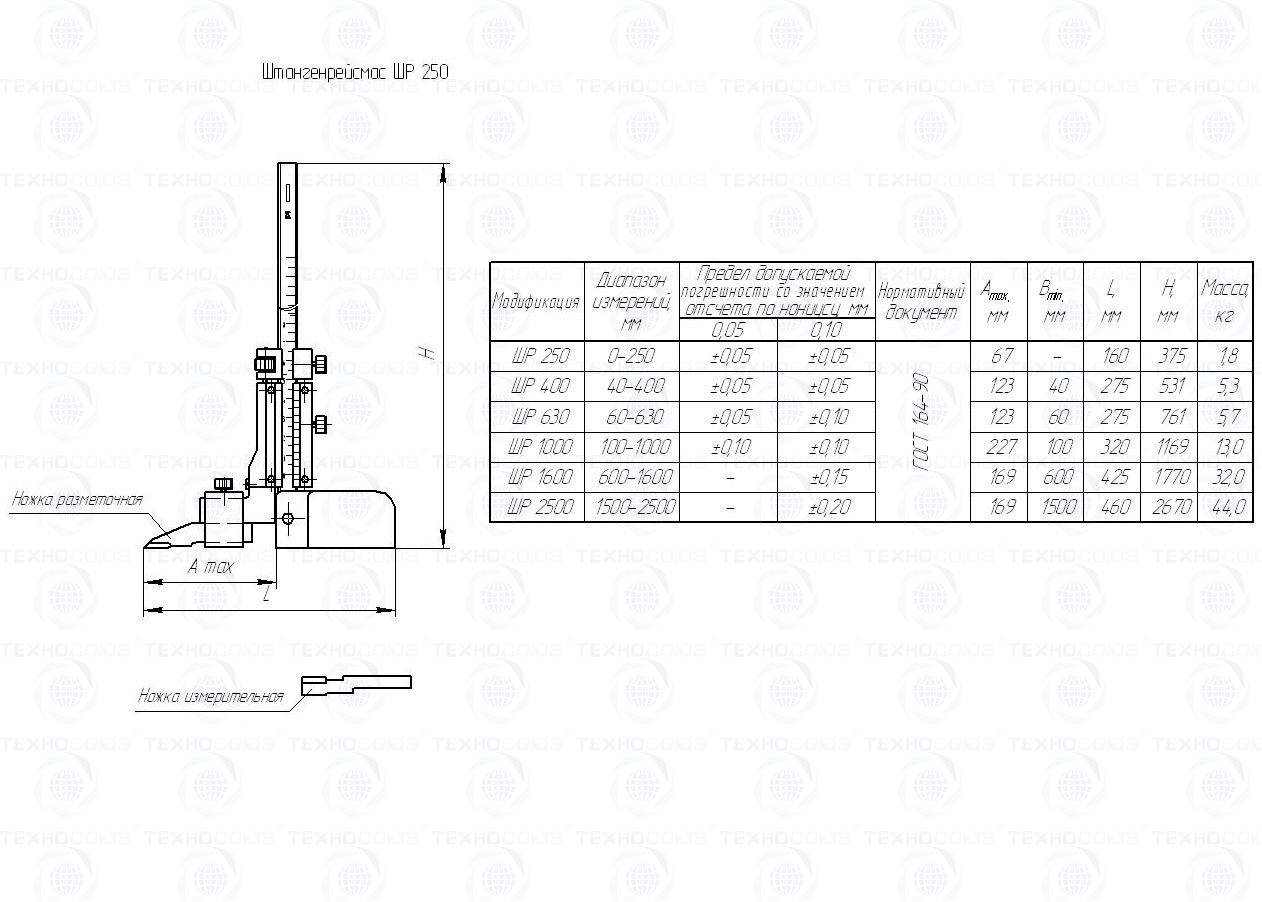 Цена деления 0,05 мм. Диапазон измерения от 0-250 мм. Предназначены для измерения и разметки размеров. Вдоль штанги перемещается рамка, к которой прикреплена разметочная или измерительная ножки. Разметочная ножка оснащена твердым сплавом. Рамка имеет нониус, а для облегчения установки на требуемый размер снабжена микрометрической подачей. Основные детали штангенрейсмаса хромированы. ГОСТ 164-90. Поставляется в двух вариантах с поверкой и без поверки!