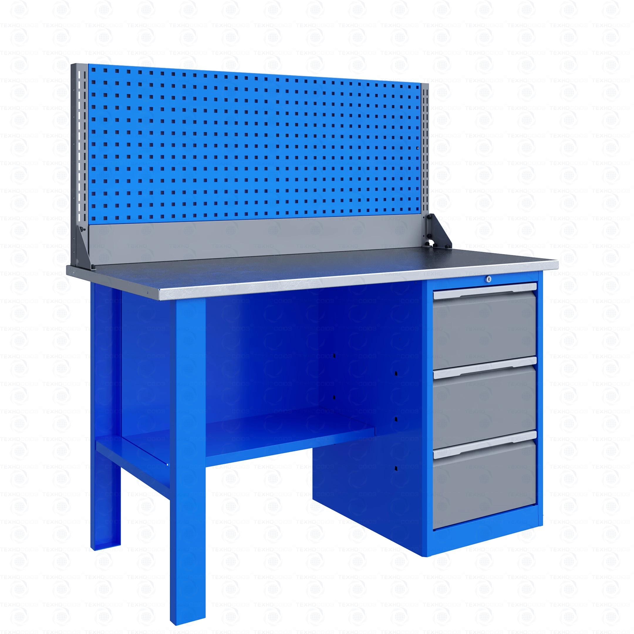 Верстак серии Technic 141.13.2-1 состоит из столешницы шириной 1396 мм, опоры, тумбы P3 с тремя большими ящиками, полки-стенки и одинарного экрана с кронштейнами.