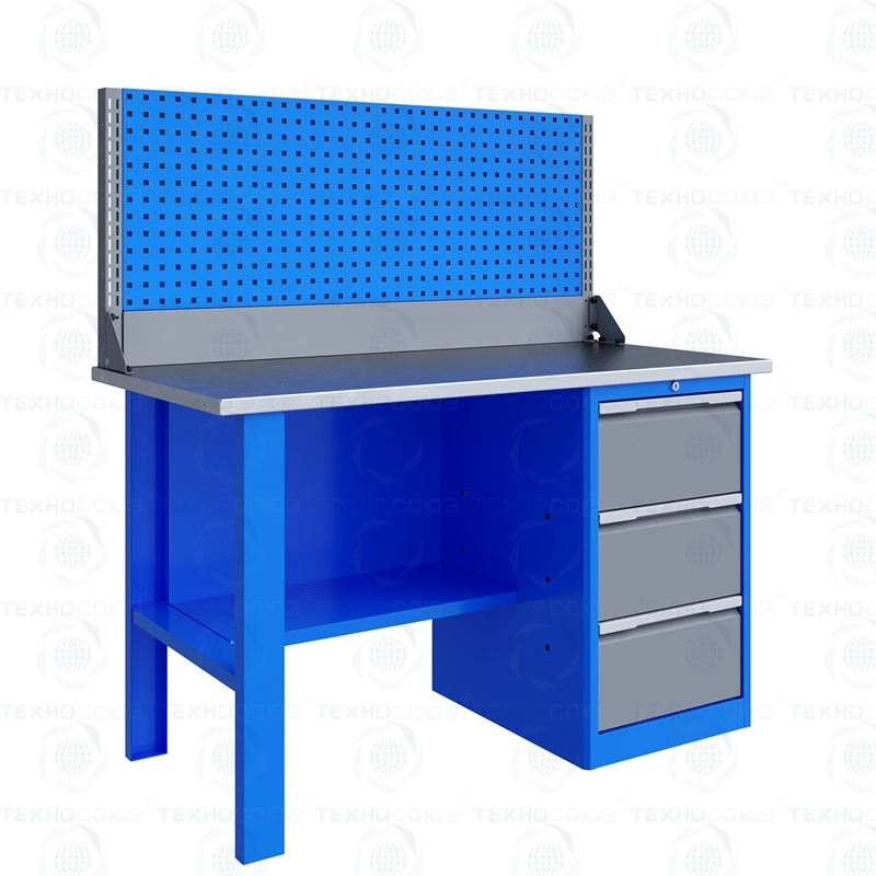 Однотумбовый. Допустимая нагрузка на столешницу 750 кг. Опорные элементы выполнены сварными из холоднокатаной стали. Для выполнения сборочных, ремонтных, слесарных, монтажных и других видов работ на производстве, в сервисных центрах, мастерских, гаражах, а также для обучения технологии в учебных заведениях. Комплектуется полкой-стенкой, расположенной под столешницей для удобного размещения габаритного инструмента и оснастки. Размеры верстака: 855x1396x696 мм. Вес: 76 кг. Поставляется в 4 комплектациях на выбор.